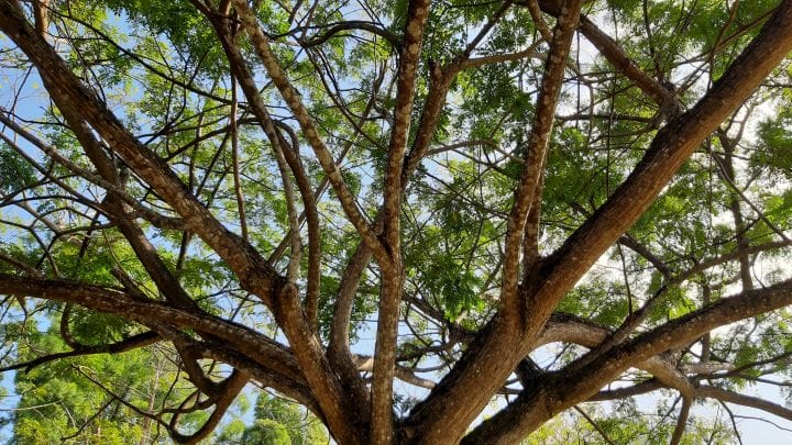 In hardwood trees, that results in rings being thicker on the top side of branches, stuffed with lots of stretchy fibers to accommodate the downward pull of tension. Softwood trees build up the lower side of branches with rigid lignin to resist the crushing stress of compression. In all trees, structural support is highly adaptable, working at odd angles and curves, and built right into the material used for construction, at the micro scale.