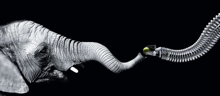 Festo, a German company that specializes in automation, has created a new type of robotic arm that is lightweight, flexible, and resilient. In a factory setting, traditional robotic arms made from heavy metal can be very dangerous for people to work around. Festo’s Bionic Handling Assistant solves this problem with inspiration from the elephant’s trunk. There are no bones in an elephant’s trunk. Instead, there are roughly 40,000 muscle bundles that work together to provide an appendage that can be soft and flexible, while also transmitting large forces and performing precise motions in 3 dimensions. Instead of muscles, Festo’s design uses hollow, air filled plastic chambers that are inflated and deflated to control the arm’s movements and give it a range of motion similar to the trunk. The air-filled arm is also much safer for workers to interact with and can be used in settings such as laboratories and hospitals where traditional robotic arms may not be appropriate.