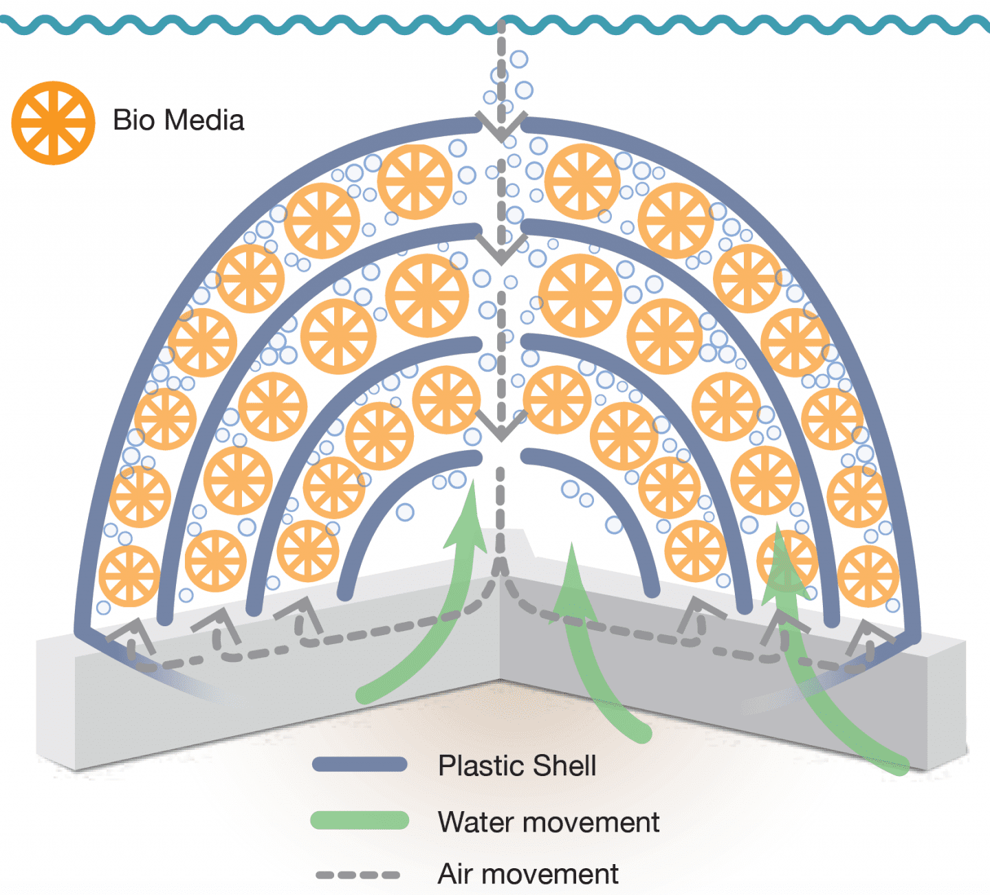 Bio-Domes sit at the bottom of wastewater treatment lagoons and consist of concentrically nested domes that are infused with air from underneath. These domes are coated with naturally occurring biofilms and provide an additional 2800 square feet of space for biofilms to grow. This helps to more effectively reduce contaminants in the water such as ammonia and nitrogen, similar to the process that occurs in wetlands.