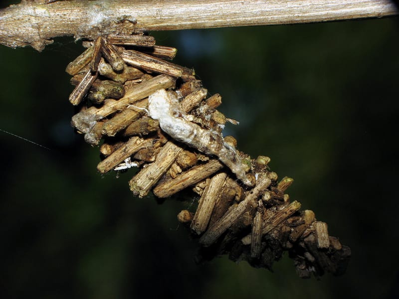 Larvae of bagworm moths protect themselves from being crushed by building spiral-patterned cases out of environmental materials such as twigs, leaves, and silk.