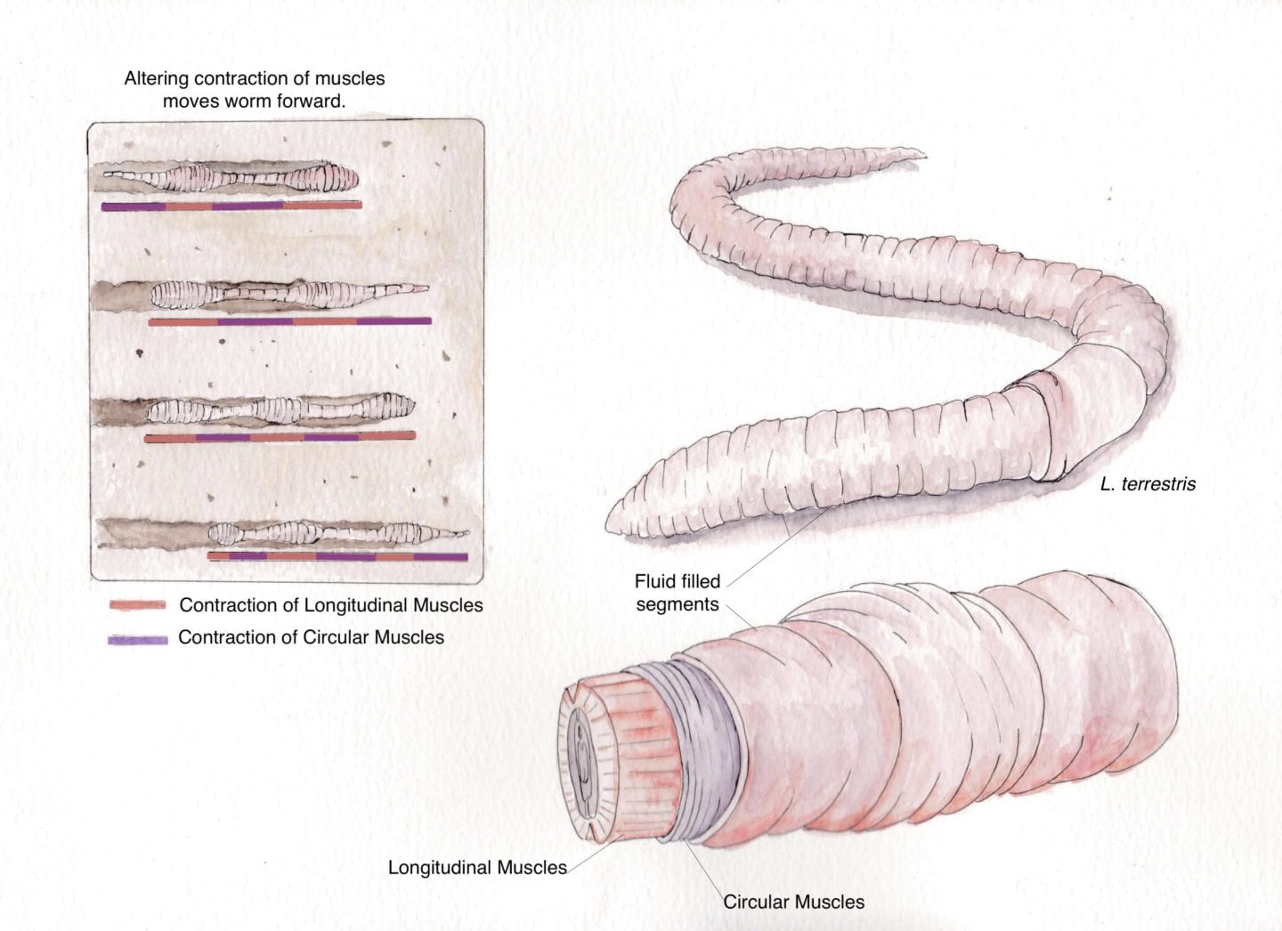 The soft, flexible body of the earthworm is divided into segments, which allows it to easily move through the soil to find food. The earthworm’s body is also known as a hydrostatic skeleton, which is a flexible skeleton filled with fluid. A common earthworm (L. terrestris ) can range from 110-200 mm in length with anywhere from 135-150 segments in its body. Each segment of the worm’s body contains muscles that work independently of every other segment. The internal walls separate the segments and are lined with circular and longitudinal muscles. Circular muscles are wrapped around the circumference of each segment Longitudinal muscles extend down the length of each segment. The muscles create a soft barrier between segments, allowing the segments to be controlled independently. Inside each segment, there is fluid that holds the segment’s shape. As the earthworm burrows, it squeezes into tightly packed soil. This creates a high-pressure environment that could damage the worm. However, the fluid inside the segments helps prevent damage to the earthworm. Fluid cannot change volume because the molecules in the fluid are very close together. The high-pressure environment cannot press the molecules even closer, thus maintaining the earthworm’s shape.