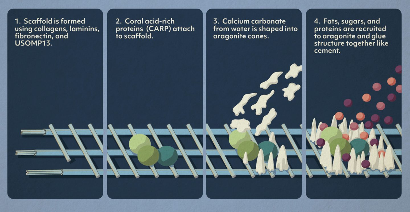 First, a set of s containing collagens, laminins, fibronectin, and USOMP13 form a scaffold. Second, molecules called coral acid-rich proteins (CARP) attach to the collagens, pull calcium carbonate from the water, and shape it into a needlelike form called aragonite.