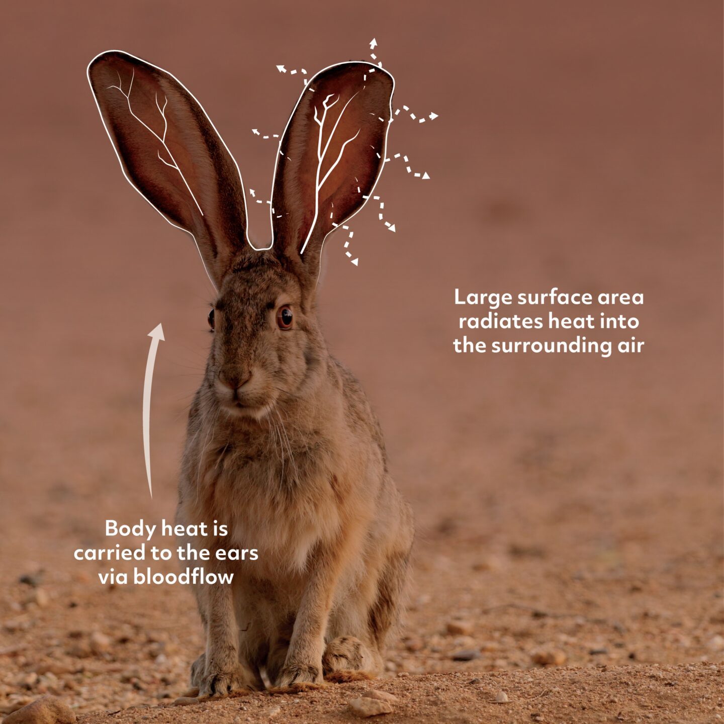 Jackrabbits live in the desert where they’re exposed to extremely hot daytime temperatures, but these animals are able to stay cool by releasing excess heat from their oversized ears.