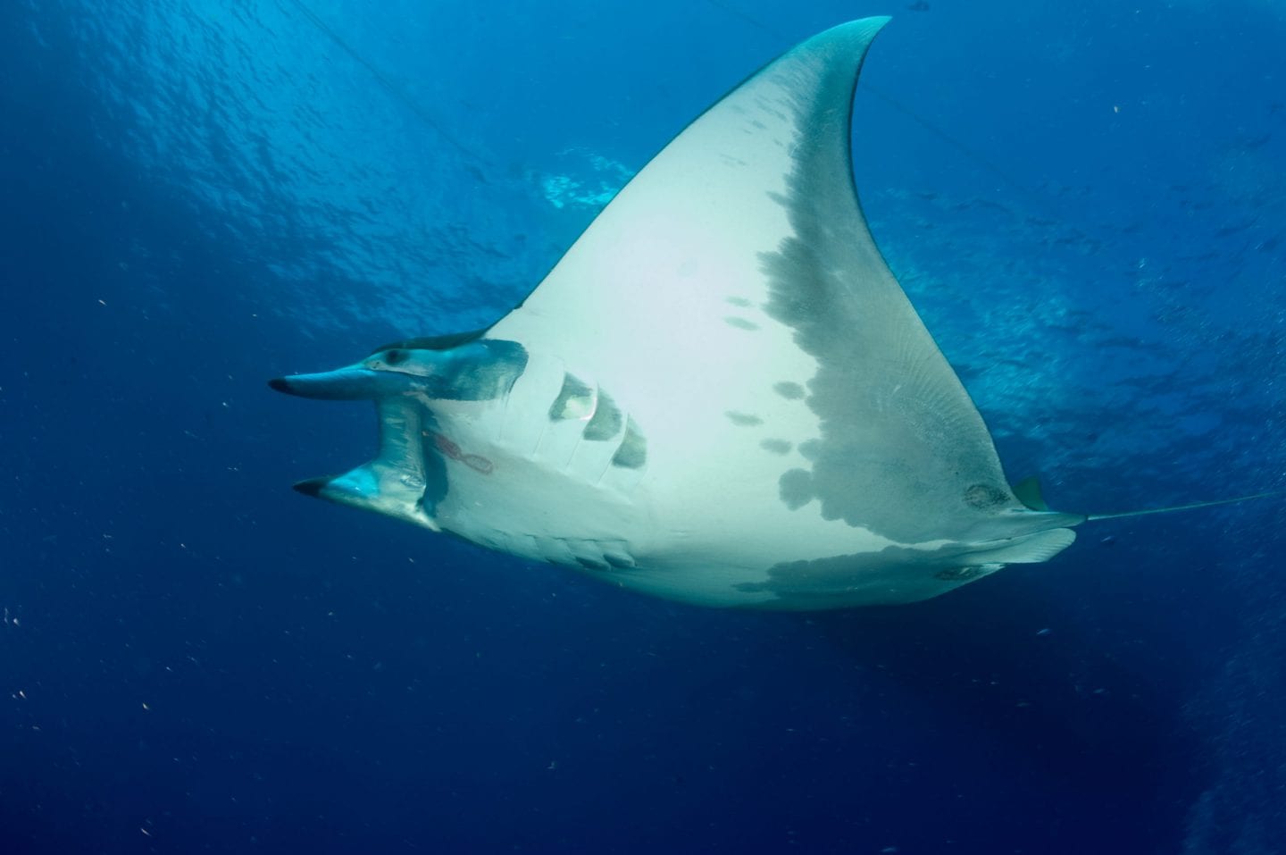 Manta rays are close relatives of sharks and can measure more than 20 feet across. They eat by bringing plankton-rich water into their mouths as they swim. They filter and ingest the plankton and then flush the remaining water out their gill slits.