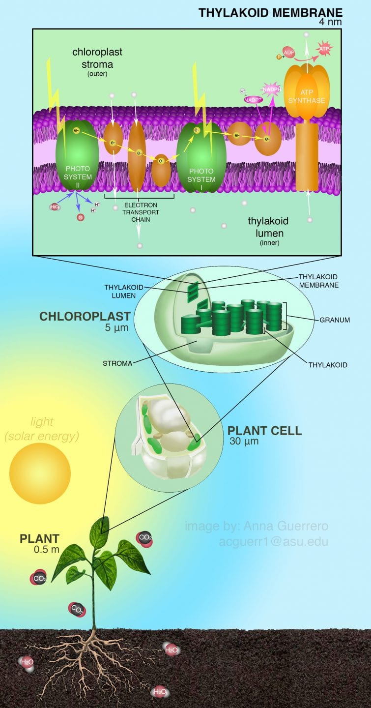 The electrons freed from chlorophyll are utilized in at least two ways. First, they are used to build up a high concentration of protons in the space inside the thylakoid (called the lumen), which in turn drives the transformation of ADP into —nature’s energy carrier molecule. Secondly, they reduce NADP+ to . These transformations take place in the , the area outside of the thylakoid folds but still inside the chloroplast “bag.” The energy brought by ATP and NADPH fuels a series of reactions in which carbon dioxide is persuaded to give up its precious cargo of carbon to build and other key metabolic compounds. As these reactions (known as the Calvin Cycle) occur, the molecules are depleted back to ADP and NADP+ returning to the thylakoid folds to replenish their store of energy through sunlight-stimulated chlorophyll.