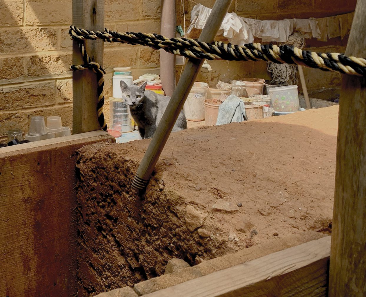 This soil is a hyperobject, an incalculable mass of bioproducts, rocks, sand, water, and layers upon layers of life that has existed and will keep nourishing the life that will continue to exist. But what lives in the soil? Or what uses the soil as its home? Bacteria, microorganisms, insects, roots, worms, animals and other organic matter in decomposition. And all this natural occurring material is an integral part of the walls that Santiago and his wife make with tapia pisada.