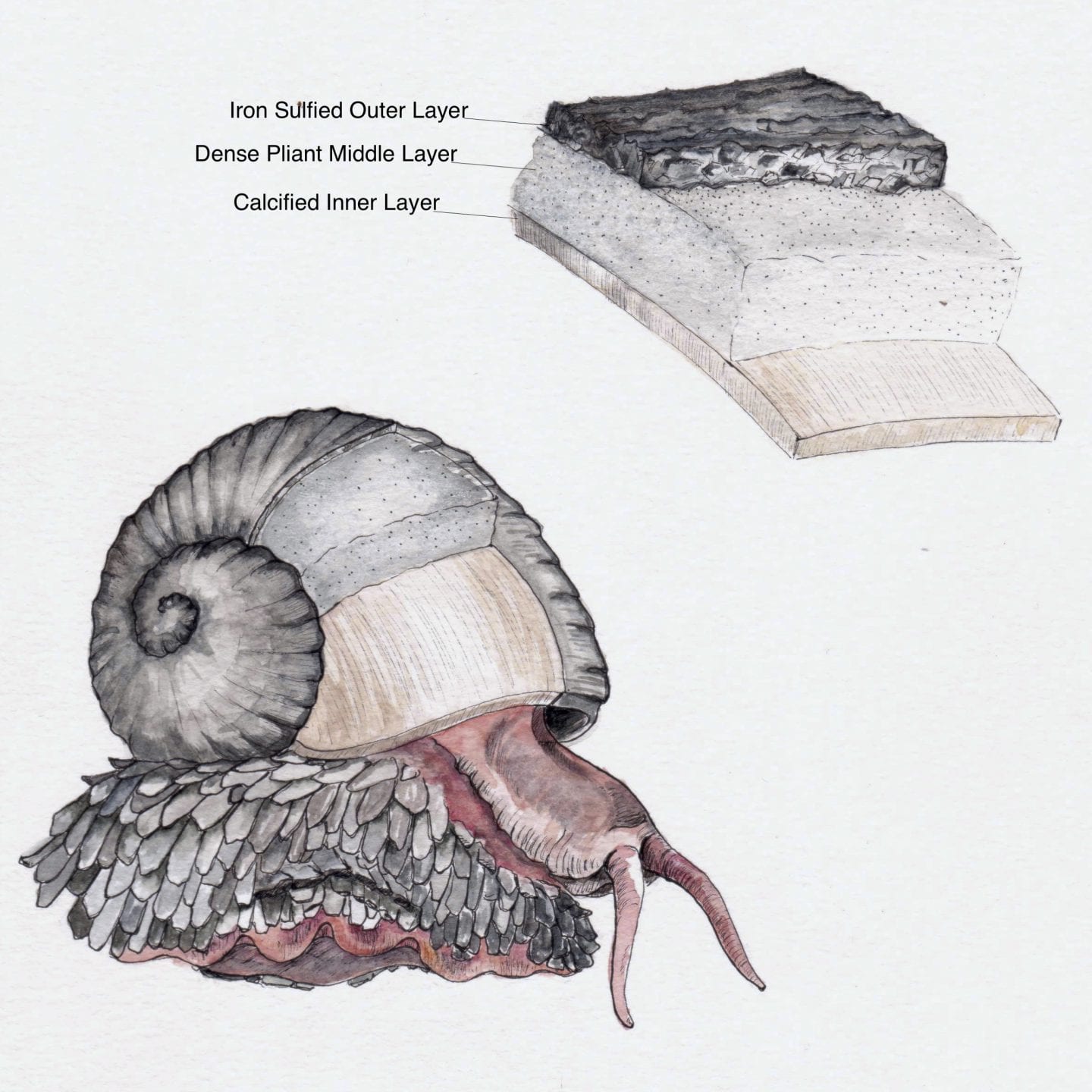 At the bottom of the Indian Ocean are large hydrothermal vents that spew hot water and minerals. They also provide an ecosystem for a variety of bizarre species adapted for living in harsh conditions. One such species is the golden scale snail (Chrysomallon squamiferum, sometimes called the scaly-foot) which feeds off of the vent’s nutrients. Adhered to the vent structures, the snail is vulnerable to predators such as crabs and venomous snails that can puncture or crush the scaly-foot snail. To protect itself, the snail uses a hard, armor-like shell with a tri-layered composition. Each layer has distinct chemical and physical properties that enable them to play different roles in managing forces from predatory attacks.