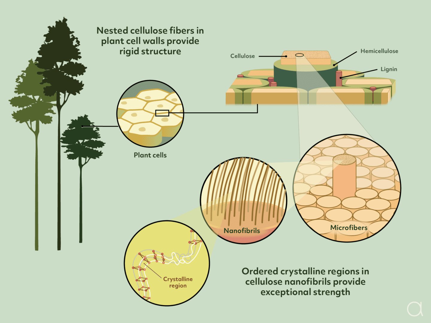 Scientists have been researching more ways to use cellulose. They have found that cellulose can be broken down into very small components, called nanocrystals. Nanocrystals are separated from cellulose to isolate the strongest and most useful part of the cellulose. This means that nanocrystals have other properties that are not found in cellulose. For example, nanocrystals are strong and have low thermal conductivity. Nanocrystals could be used to make biofoam, which could replace materials such as styrofoam made from fossil fuels.