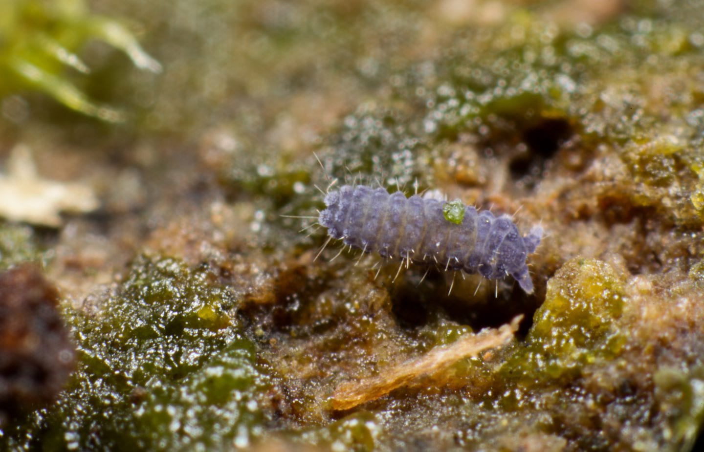 Springtails are tiny arthropods less than 6mm long. They get their name from their furcula, a tail-like appendage that they can use to launch themselves large distances and out of danger. Springtails live in moist leaf litter and other decaying organic matter where they primarily eat dead plant material and fungi. Springtail habitats are wet and, as these animals respire through their skin, repelling moisture is critically important for their survival. They are evolutionarily ancient and are very well adapted to this challenging environment that is full of oily substances released from decaying matter, as well as potentially harmful microorganisms.