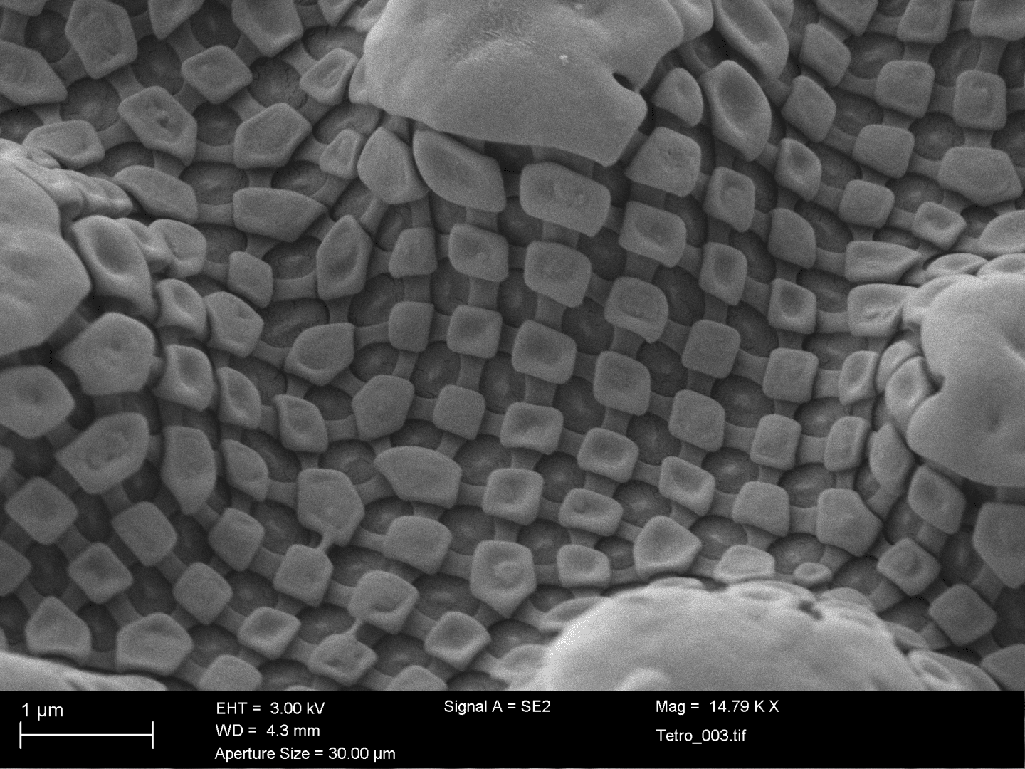 Springtail skin is rough across multiple length scales. It has relatively large bumps that are themselves coated in smaller “primary granules”. Primary granules are unique and convoluted structures approximately 250 nm across. Made from even folds in the skin, they are arranged in a regular lattice, forming nano-scale cavities that trap air. The granules have undercut overhangs that orient surface-tension forces in a way that makes the structures exceptionally effective at stabilizing the plastron. This gives springtail skin its incredible repellency.