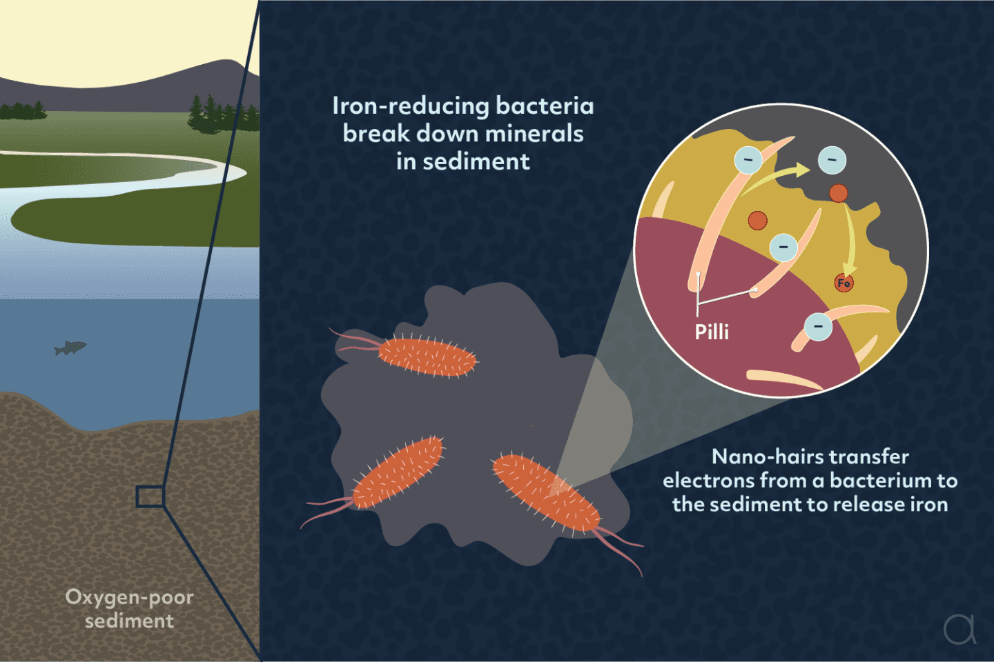 Electrogenic bacteria perform a process known as extracellular electron transfer, which enables them to “breathe” solids like iron minerals and electrodes. In the most famous example, specific electrogens, called iron-reducing bacteria, break down iron-containing minerals and convert the iron into a form that can dissolve in water. While most living things rely on oxygen to help release energy from their food, these bacteria replace oxygen when it is scarce and use iron minerals instead.