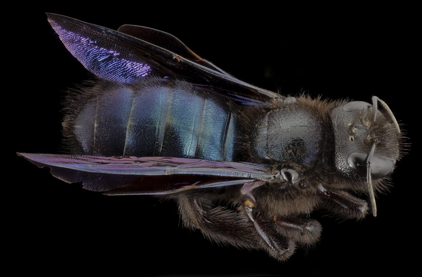 Many bees from the Osmia genus have a brilliant iridescent blue shine. The wings of Malaysian carpenter bees have a brilliant purple and green colour, while sweat bees can also exhibit a blue sheen. All of these colours are caused not by pigments in the body, but by structures that cause light scattering. The wings of the Malaysian carpenter bee have three distinct layers, each with unique structures patterning them. Parts of the wing that shine purple and blue have distinctly different structures, but the functions of these structures are still unknown.
