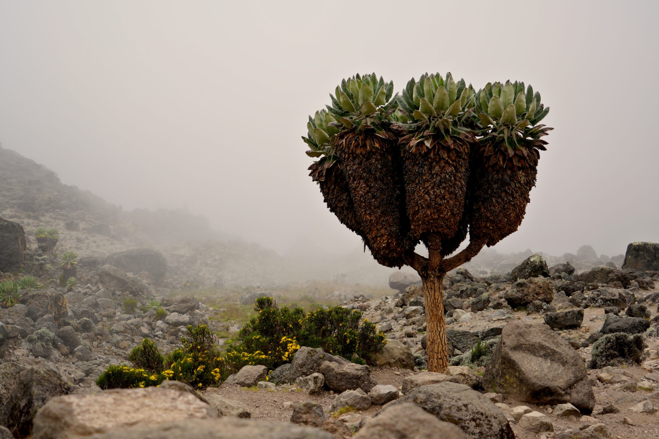 The dead leaves, while providing necessary insulation, would typically decompose and release their nutrients into the soil. However, since they remain attached to the trunk, the nutrients are not readily available to the plant’s roots. To solve this, the giant groundsel grows rootlets from its trunk that penetrate the layer of dead leaves. These rootlets absorb the nutrients from the decomposing leaves directly, allowing the plant to reclaim vital resources that would otherwise be lost.