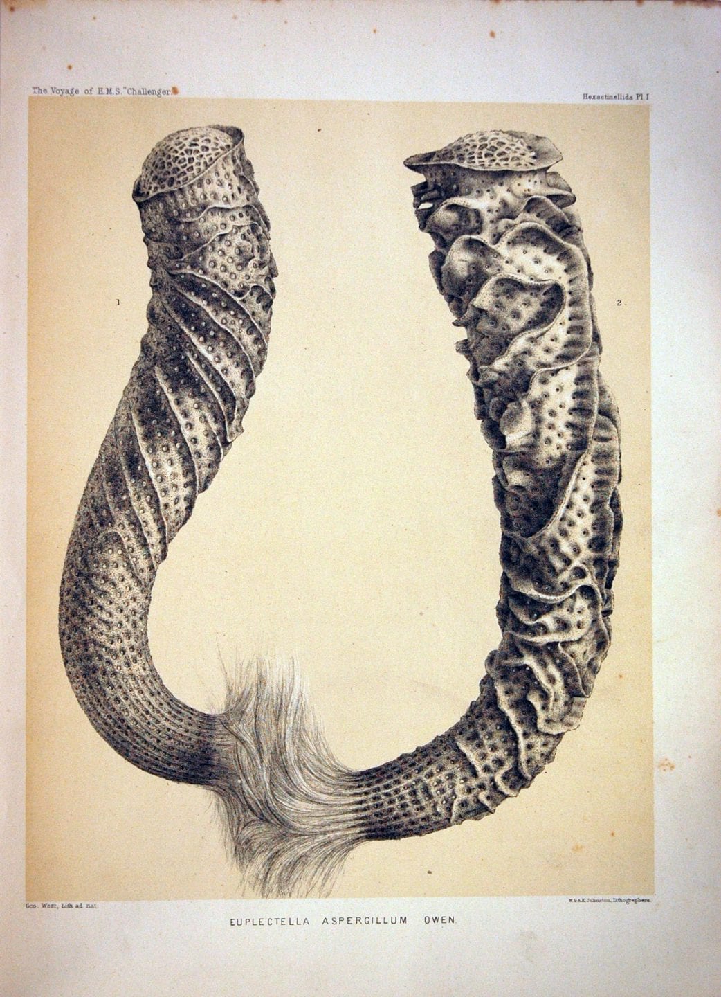 Sponges are some of the most simple of animals. They lack body symmetry and have no organs, getting their food and oxygen from the water. Most sponges work like chimneys, taking water in at the bottom and then ejecting it through the opening at the top and through the pores in their bodies. All sponges have skeletons and in some, the appropriately named “glass sponges”, the skeleton is made up of needle-like shards of glass.