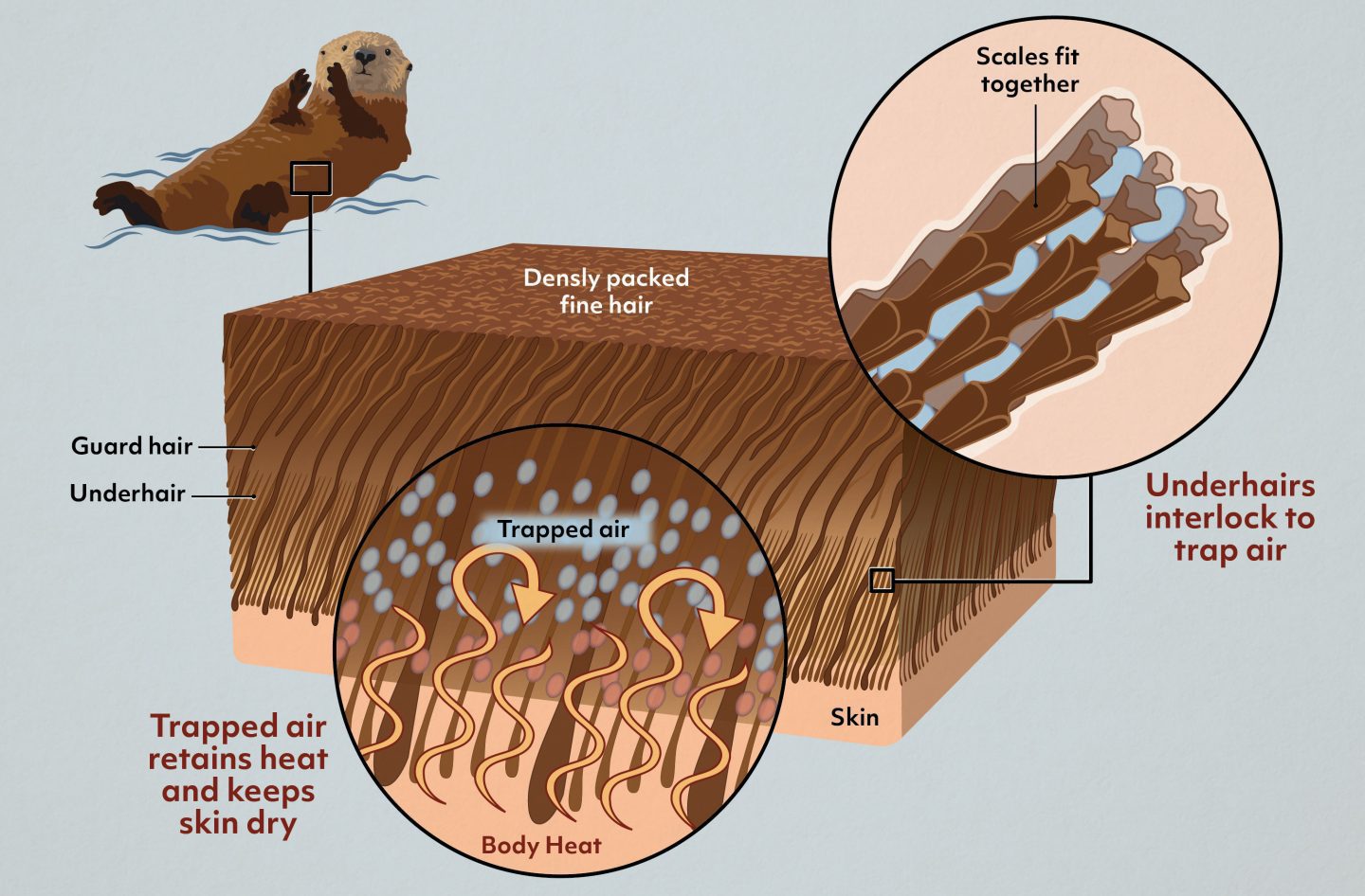 Long scales on the underhair of otters and fur seals trap air to retain heat and prevent water penetration.